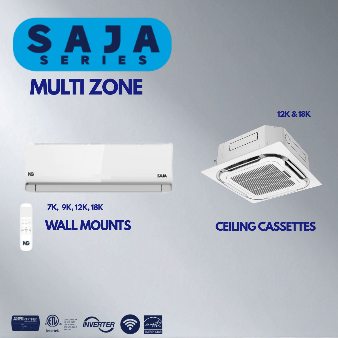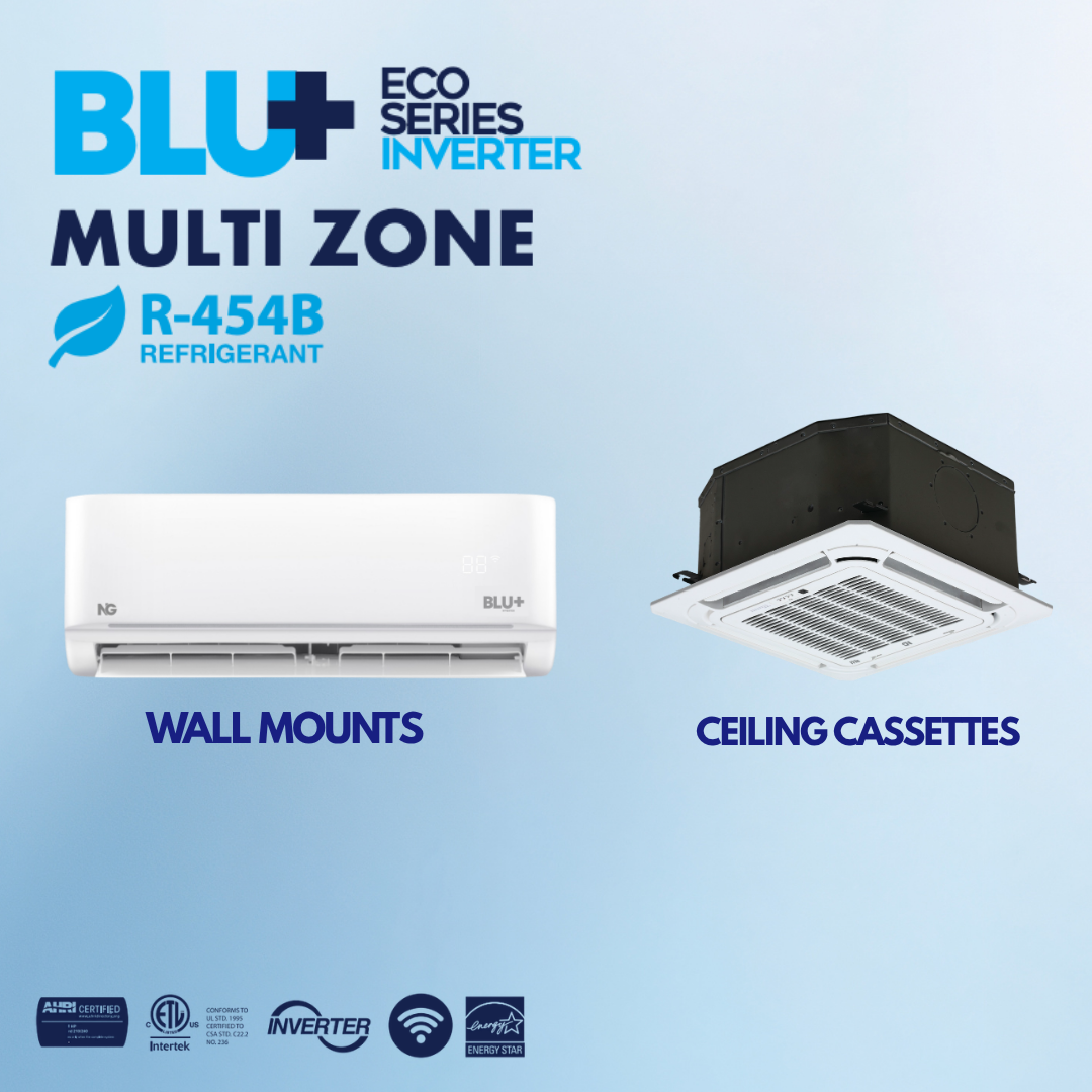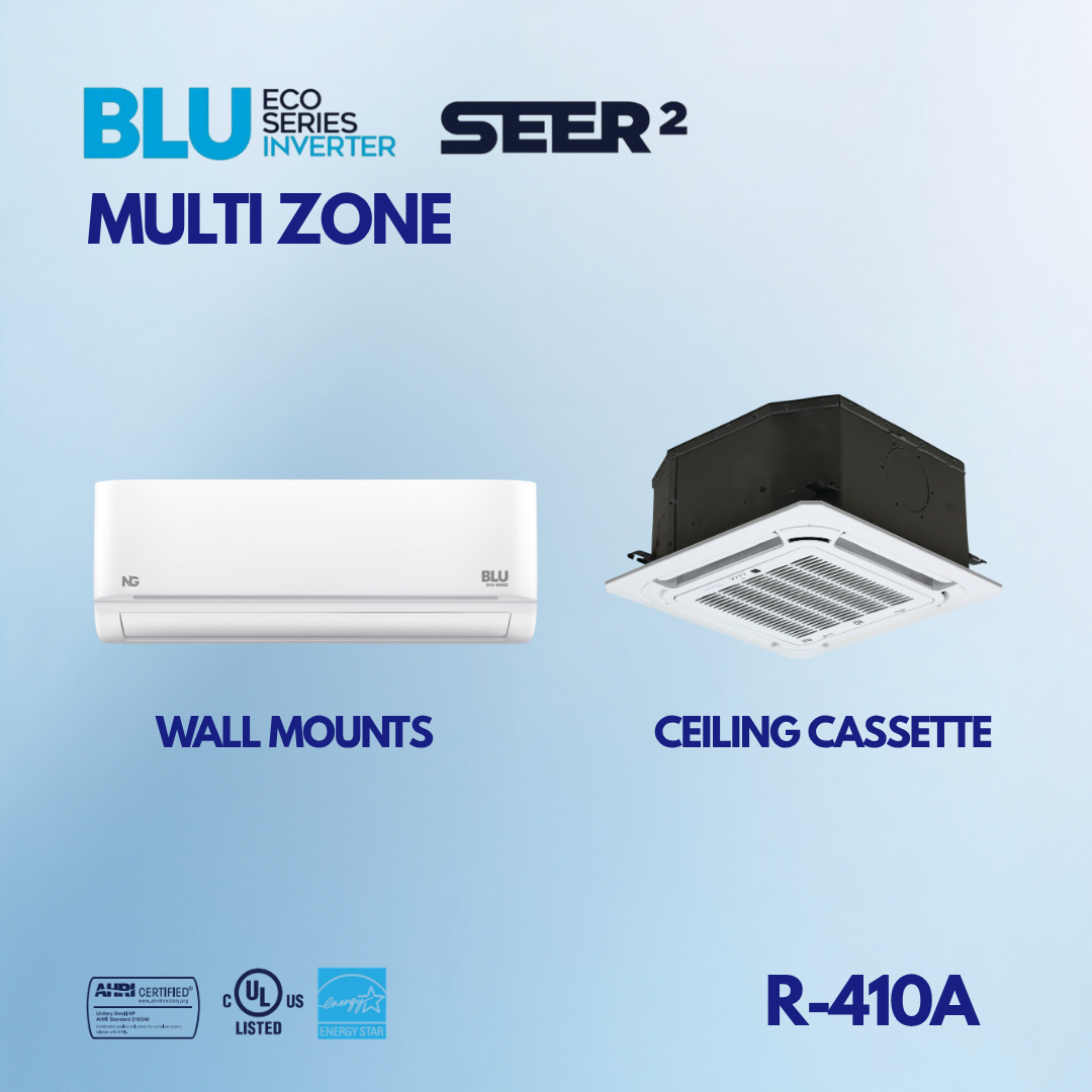 The NG BLU Multi Zone system provides efficient cooling and heating with inverter technology, ranging from 18K to 48K. With up to 23.5 SEER2, it offers optimal energy savings. Choose between indoor wall mount or cassette units with R-410A refrigerant