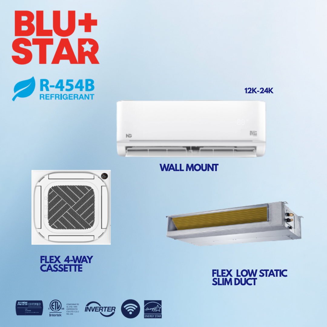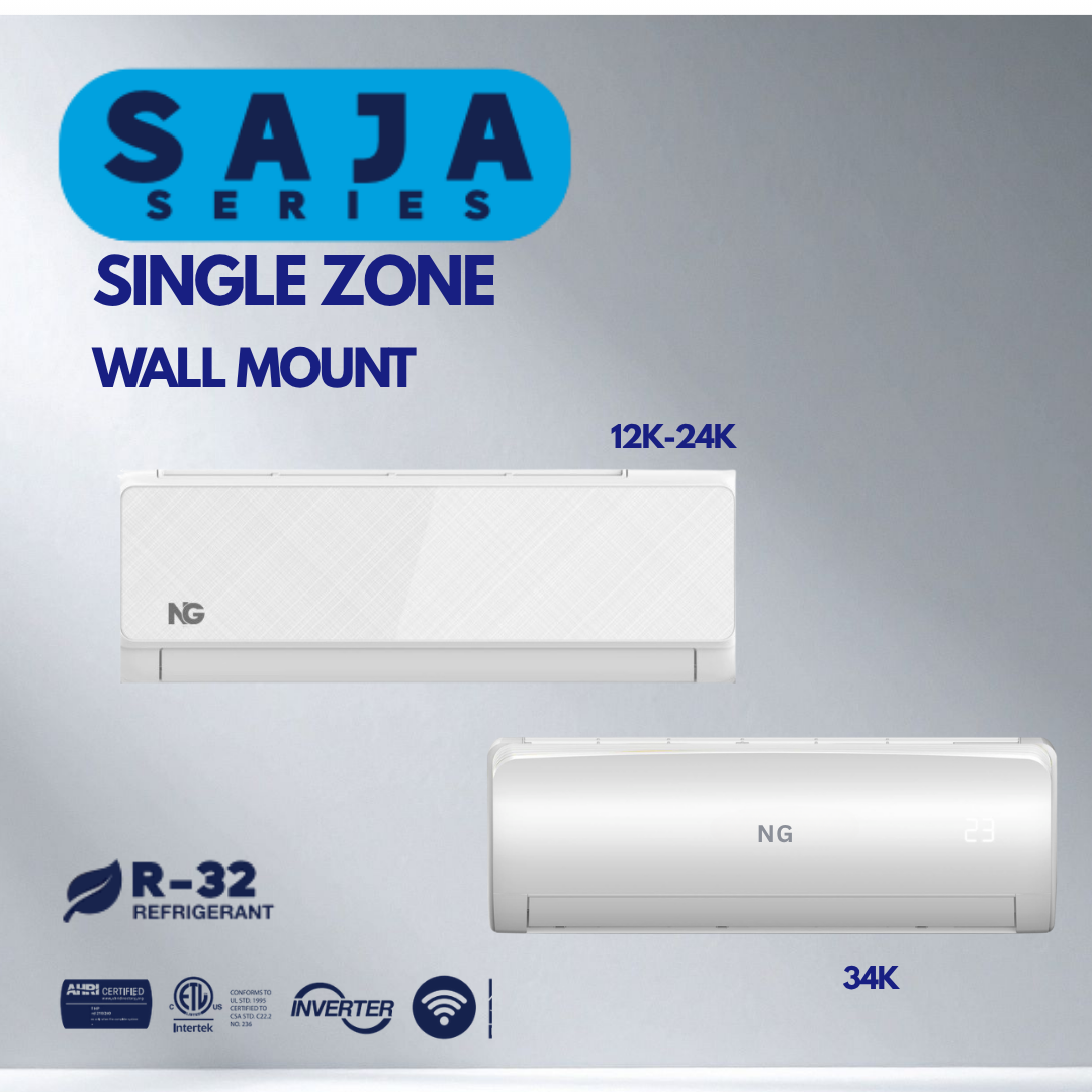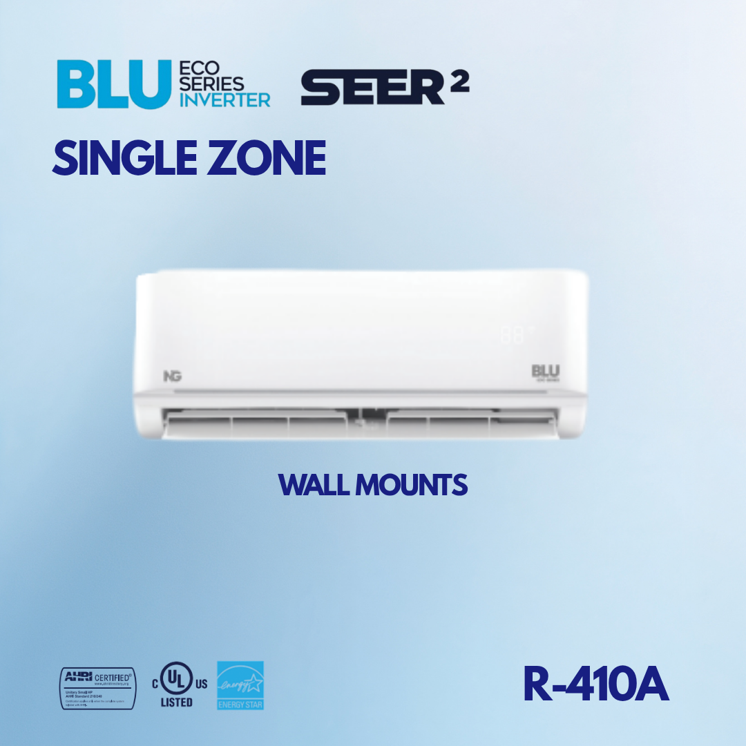 Experience efficient comfort with the NG BLU Single Zone line, offering models from 9K to 36K. With advanced inverter technology, this MiniSplit system provides both cooling and heating capabilities, delivering energy savings and consistent performance year-round. Rated up to 21.5 SEER2, it ensures optimal efficiency, making it the ideal choice for residential or commercial spaces. R-410 refrigerant.